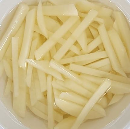 감자는 가늘고 길게(대략 3~5*(0.2~0.5)*(0.2~0.5) cm) 썰어 놓고, 찬 물에 담가 놓습니다.