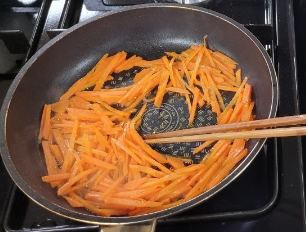 튀김용 냄비에 식용유를 적당량 넣고 소금 약간 넣고 당근을 볶아줍니다.