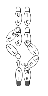 그리고 다시 4보 180도 전진 우회전하는 것입니다. 그림의 ‘,’+번호 순서입니다.