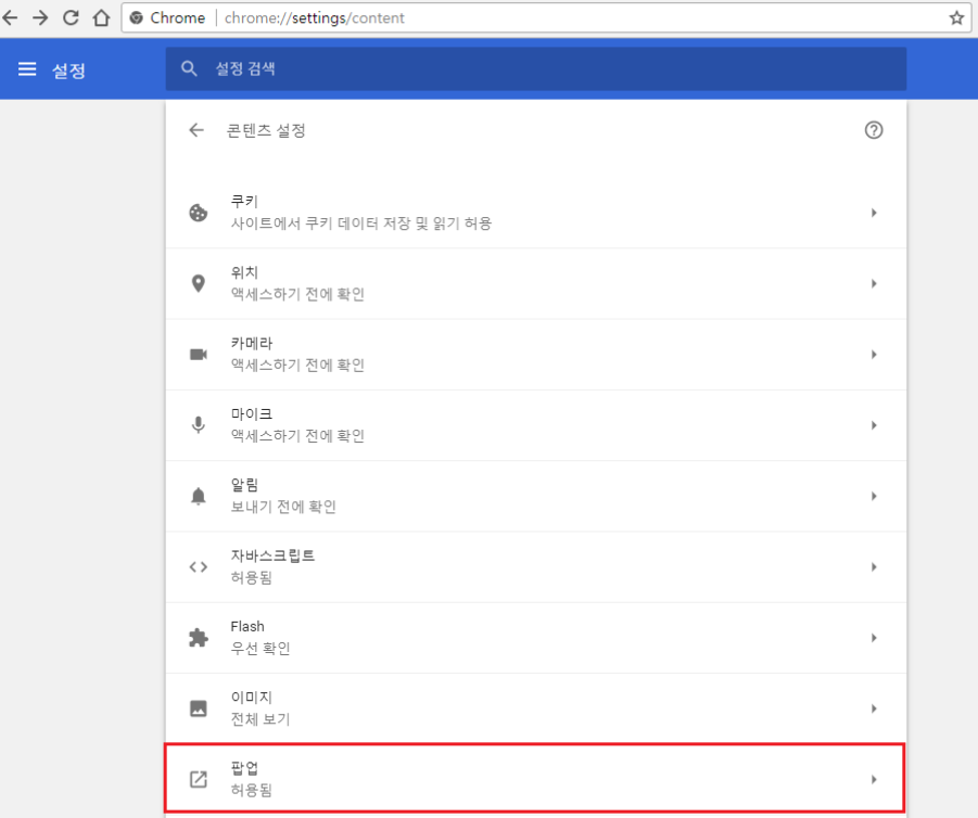 콘텐츠 설정 > 팝업 > 차단(권장) > 허용 우측 추가 클릭 > 사이트 추가에 'https://www.hometax.go.kr' 입력 > 추가 클릭합니다.