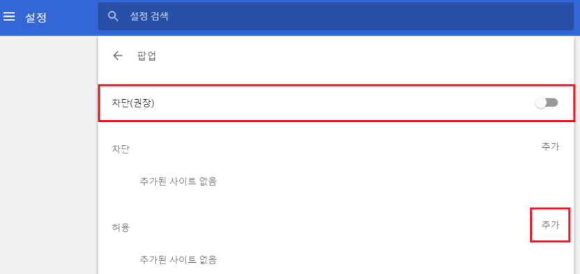 허용됨 클릭 시 차단(권장)으로 변경됩니다.