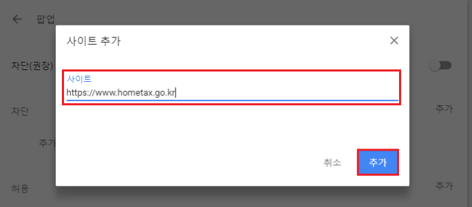 콘텐츠 설정 > 팝업 차단(권장) > 허용 우측 사이트 추가에 'https://www.hometax.go.kr' 입력 > 추가 클릭