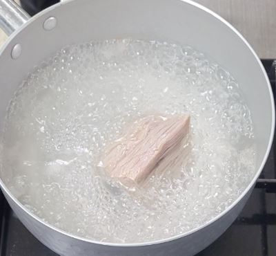 물이 끓으면 소금 약간을 넣고 장조림용 고기를 넣습니다.