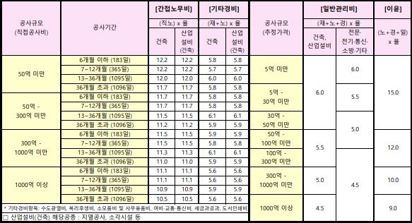 공사규모에 따른 직접공사비, 간접노무비, 기타 경비, 일반관리비, 이윤