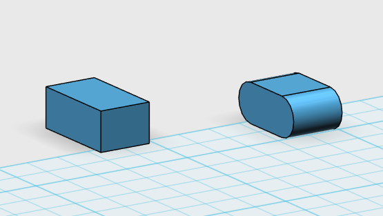 첫 번째 육면체의 전면부를 곡면처리 R=10 처리하고 두 번째 육면체를 정렬 위치 조정합니다.
